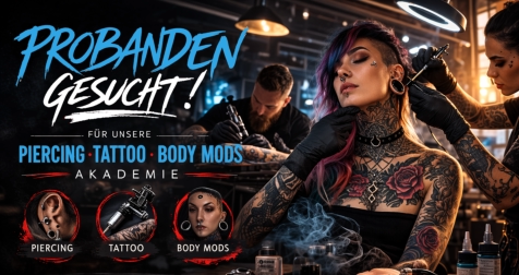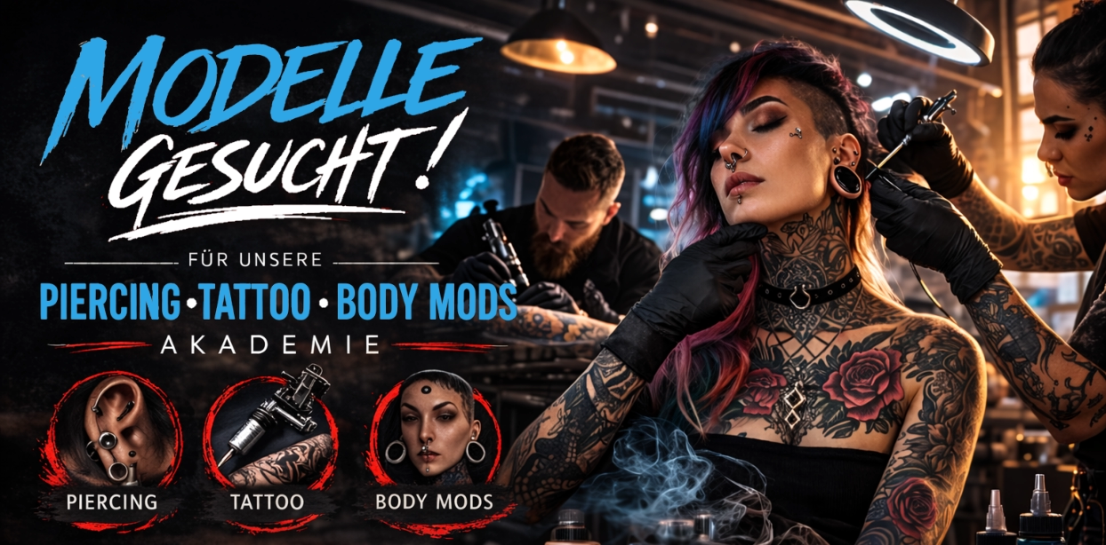 Jetzt als Modell registrieren Wenn du Interesse hast, ein kostenloses Piercing, Tattoo oder Body Modification im Rahmen unserer Schulungen zu erhalten, kannst du dich jetzt registrieren. Die Plätze für Modelle sind begrenzt und werden entsprechend der jeweiligen Schulungen vergeben.